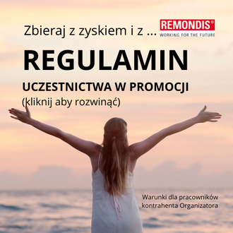 - Reklamacje co do przebiegu Promocji mogą być zgłaszane pisemnie wyłącznie na adres Organizatora: REMONDIS Electrorecycling Sp. z o.o. 05-870 Błonie, ul. Ekologiczna 2 z dopiskiem „Zbieraj z zyskiem i z... REMONDIS”, do dnia 31 stycznia 2026 roku. O zachowaniu terminu składania reklamacji decyduje data jej otrzymania przez Organizatora.